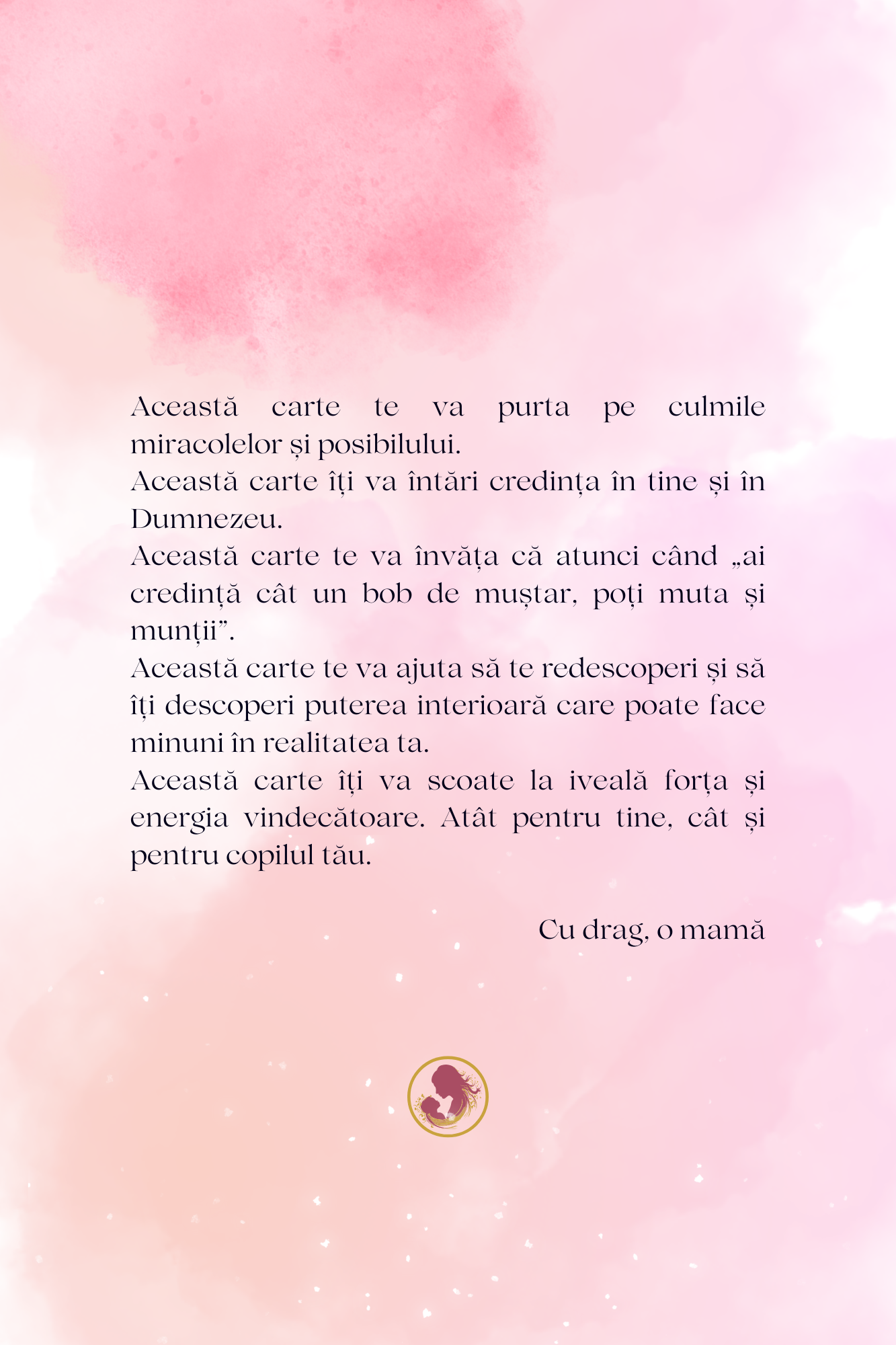 ”Am comandat cartea dumneavoastră, am primit-o ieri și am și terminat-o. Am citit-o într-un suflet și abia aștept sa o recitesc pentru a pune în aplicare tot ce e necesar. Deja după prima citire mi-am schimbat modul de gândire și clar acum știu ca al meu copil este perfect sanatos. Va multumesc din suflet, este fix ce aveam nevoie după aproape un an și 3 luni de neputință, supărare, frustrare, suferință și tristețe... Este o raza de lumina, dar nu orice lumina, e chiar Luminița de capătul tunelului. Sunt convinsa ca al meu copilaș este vindecat, sănătos și minunat.” - mamă și medic