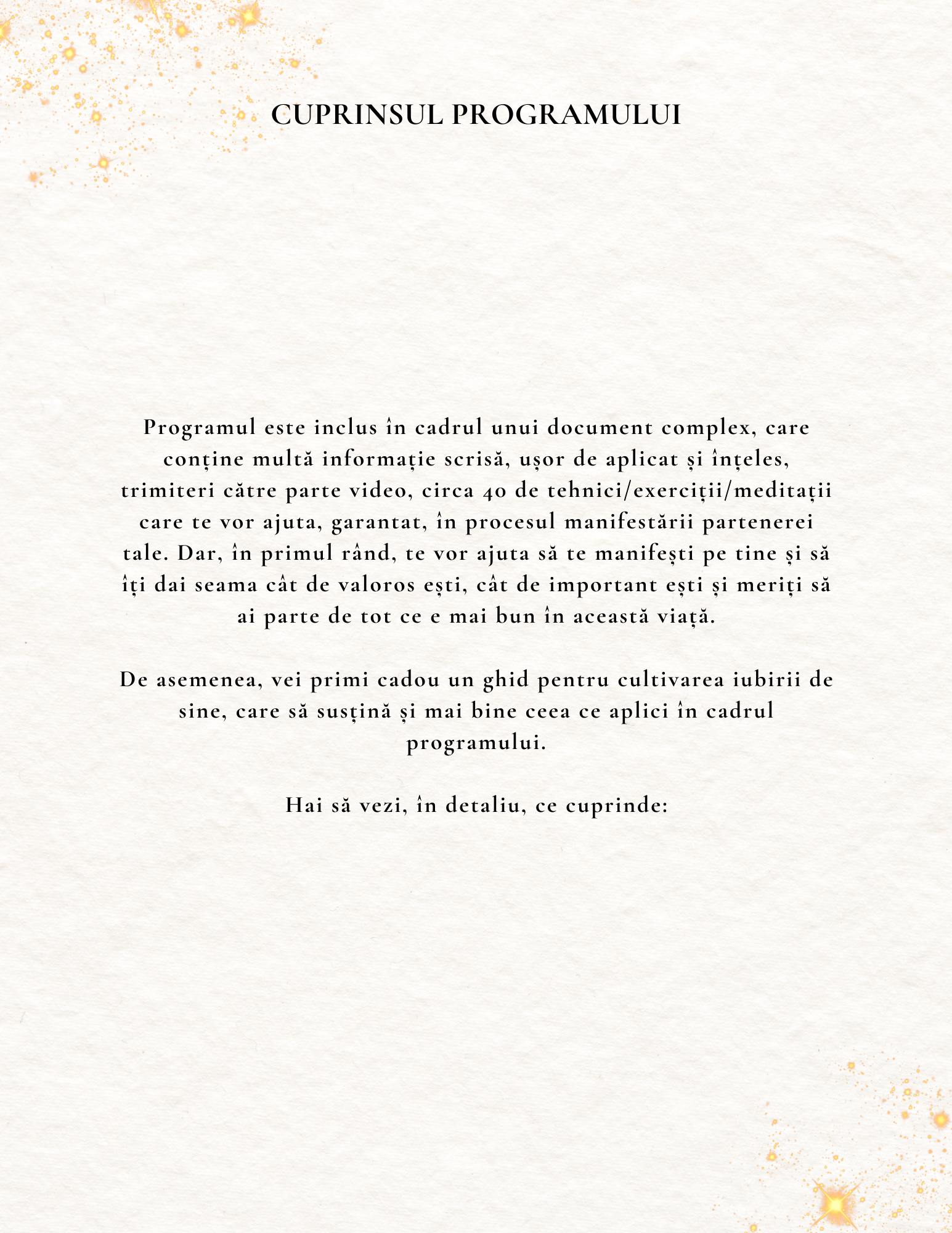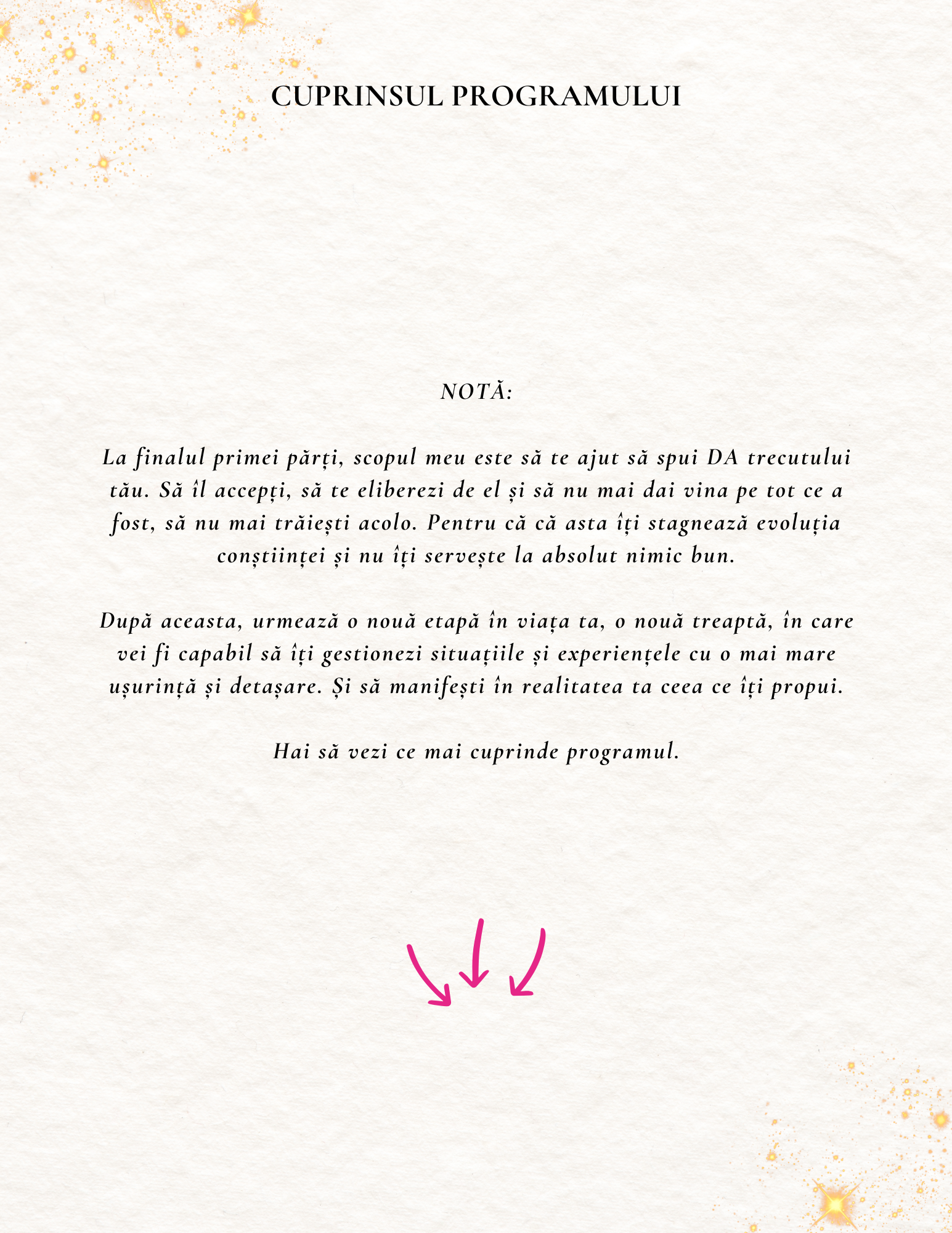 În primul rând, îți mulțumesc că ești aici și te felicit că ți-ai dat voie să te alegi și să investești în tine - o investiție care îți va fi de folos o viață întreagă, vei vedea.